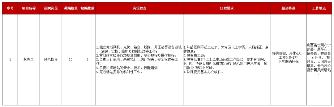 某央企單位因工作需要,由山西晉鑫仁和人力資源管理有限公司公開招聘數(shù)名風電檢修勞務外包工作人員,具體公告如下: